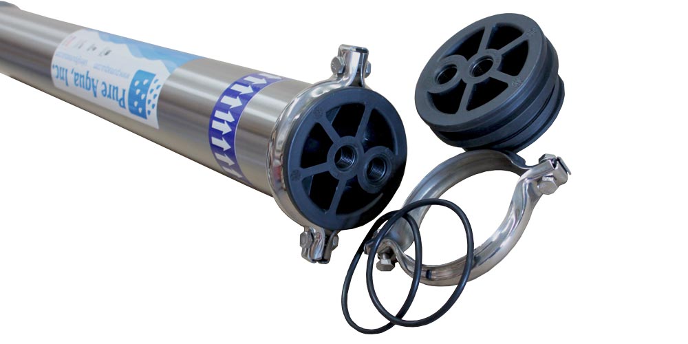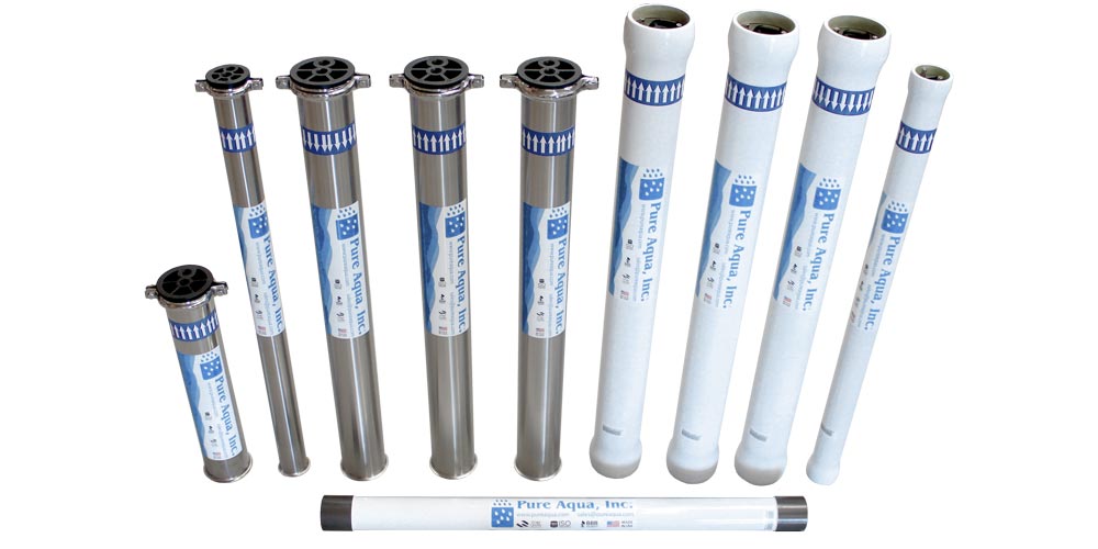 Pure Aqua’s membrane housings are the ideal solution for Reverse Osmosis and nanofiltration systems. They are available in FRP. The FRP housings or pressure vessels are manufactured by a Superior Filament Winding Technology using Computer Controlled Winding and Design Processes. The pressure vessels are available in 2.5” and 4” diameters with pressure ratings ranging of 300 psi or 1000psi. We stock large inventory of RO pressure vessels and spare parts.